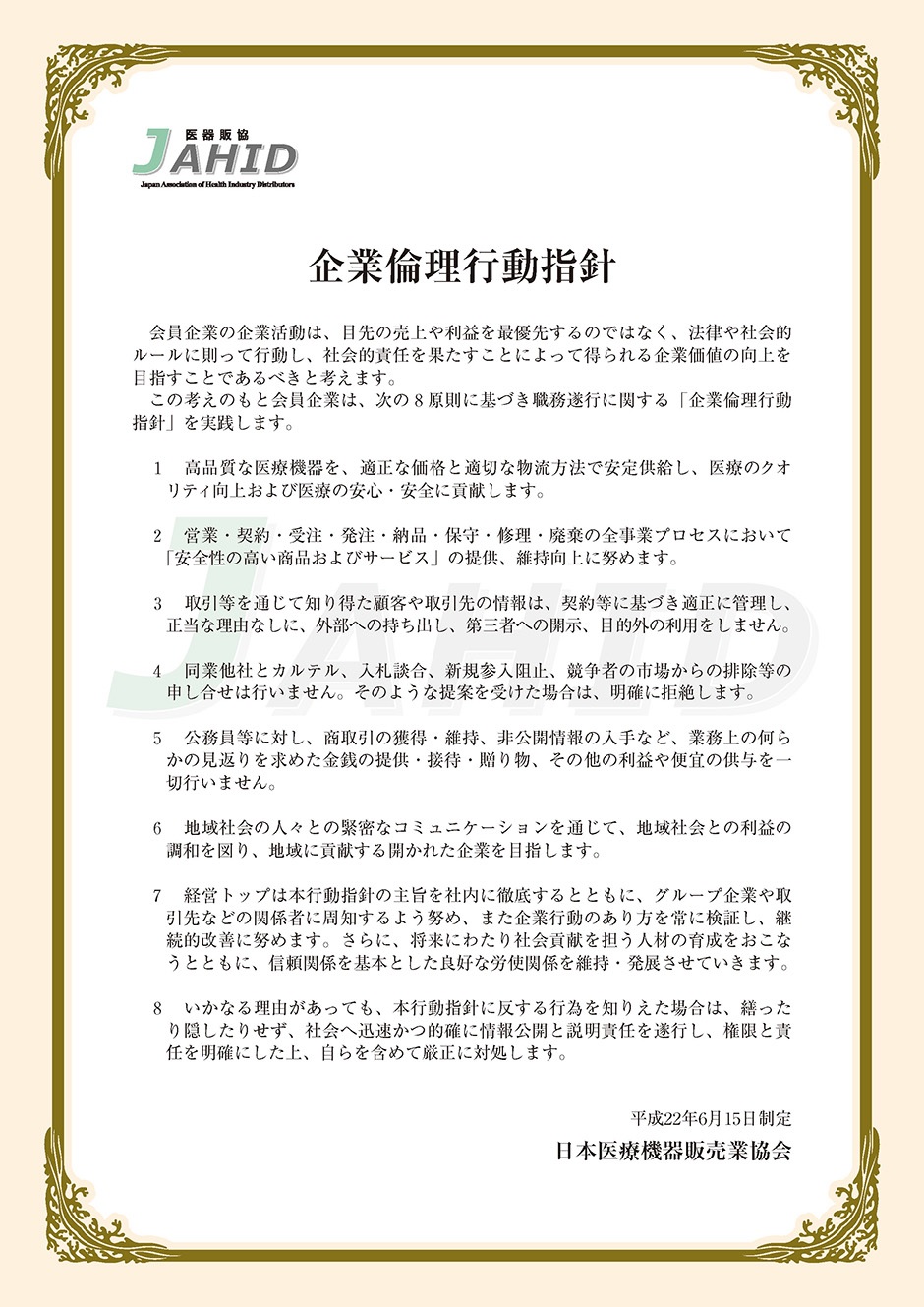 当社は医療に携わる企業として、社会的使命と重要性を認識し、当社の基本理念と日本医療機器販売業協会の「企業倫理行動指針」に基づき行動します。